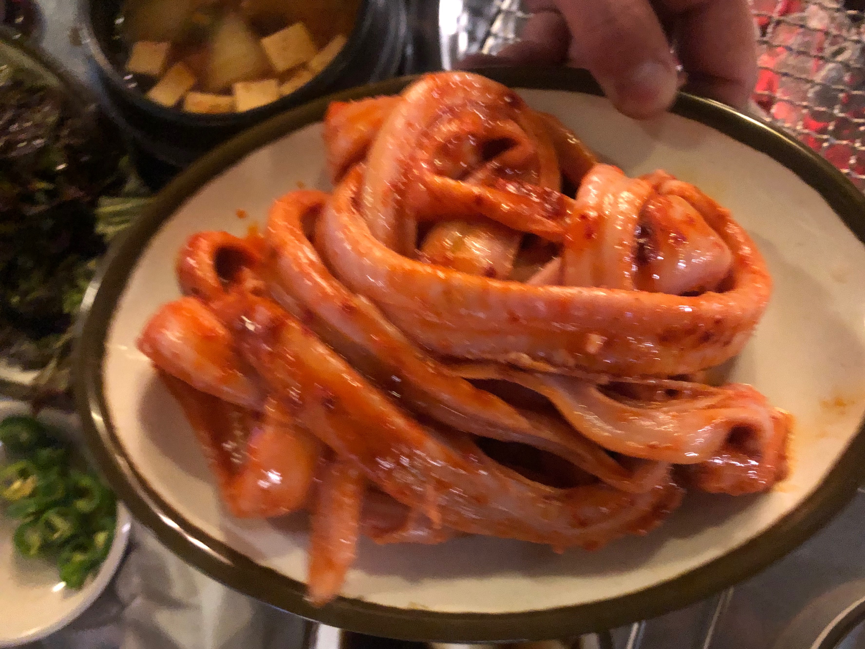 껍질을 벗겨낸 채로 빨간양념을 해서 제가 먹은 것처럼 숯불로 굽거나