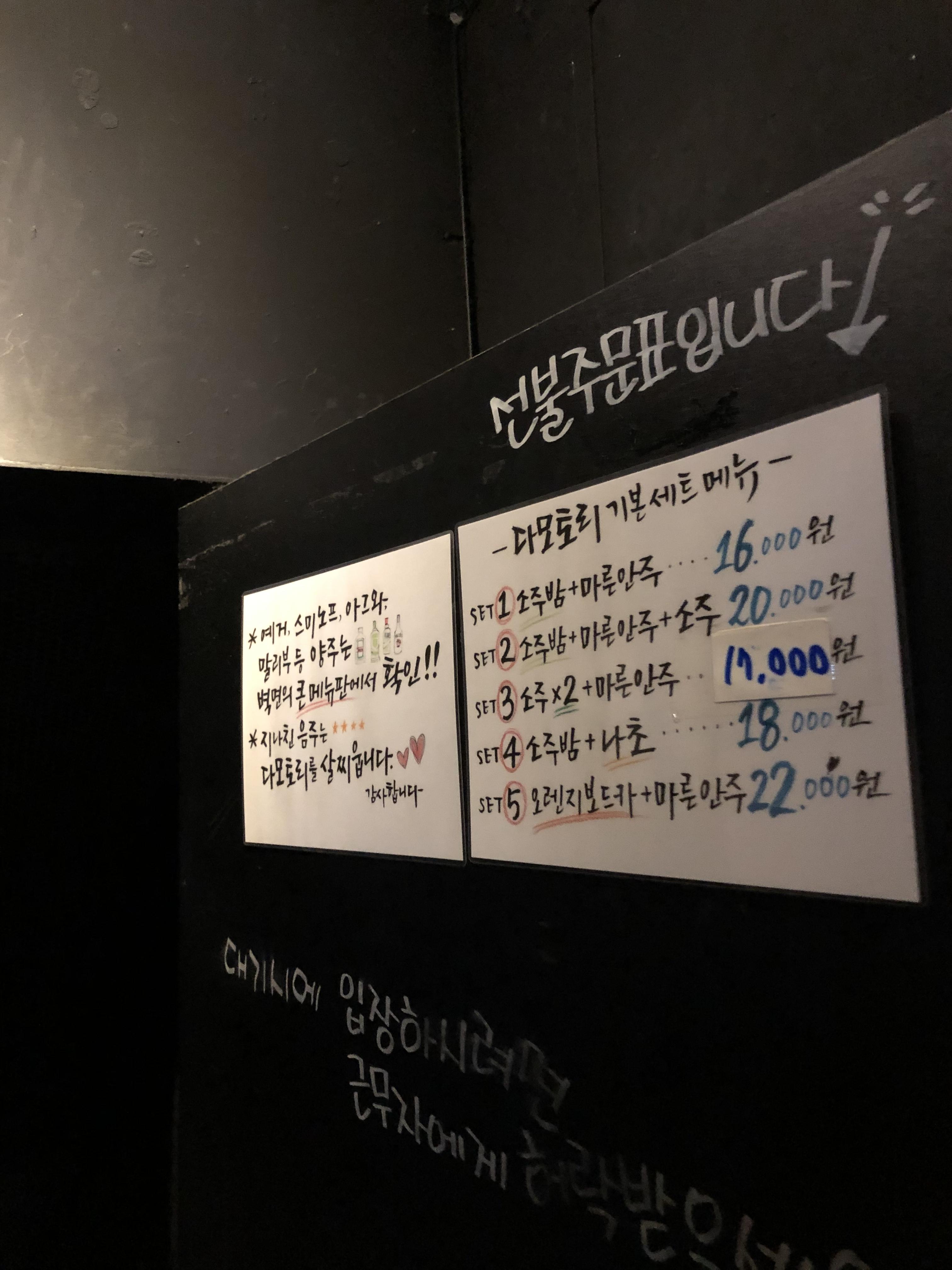 주문은 선불로 이루어집니다. 다모토리 기본 세트 메뉴라고 해서 메뉴가 보이죠? 소주밤, 마른안주도 많이들 드시는데 드시고 나서 다소 놀라시는 것 같아요.